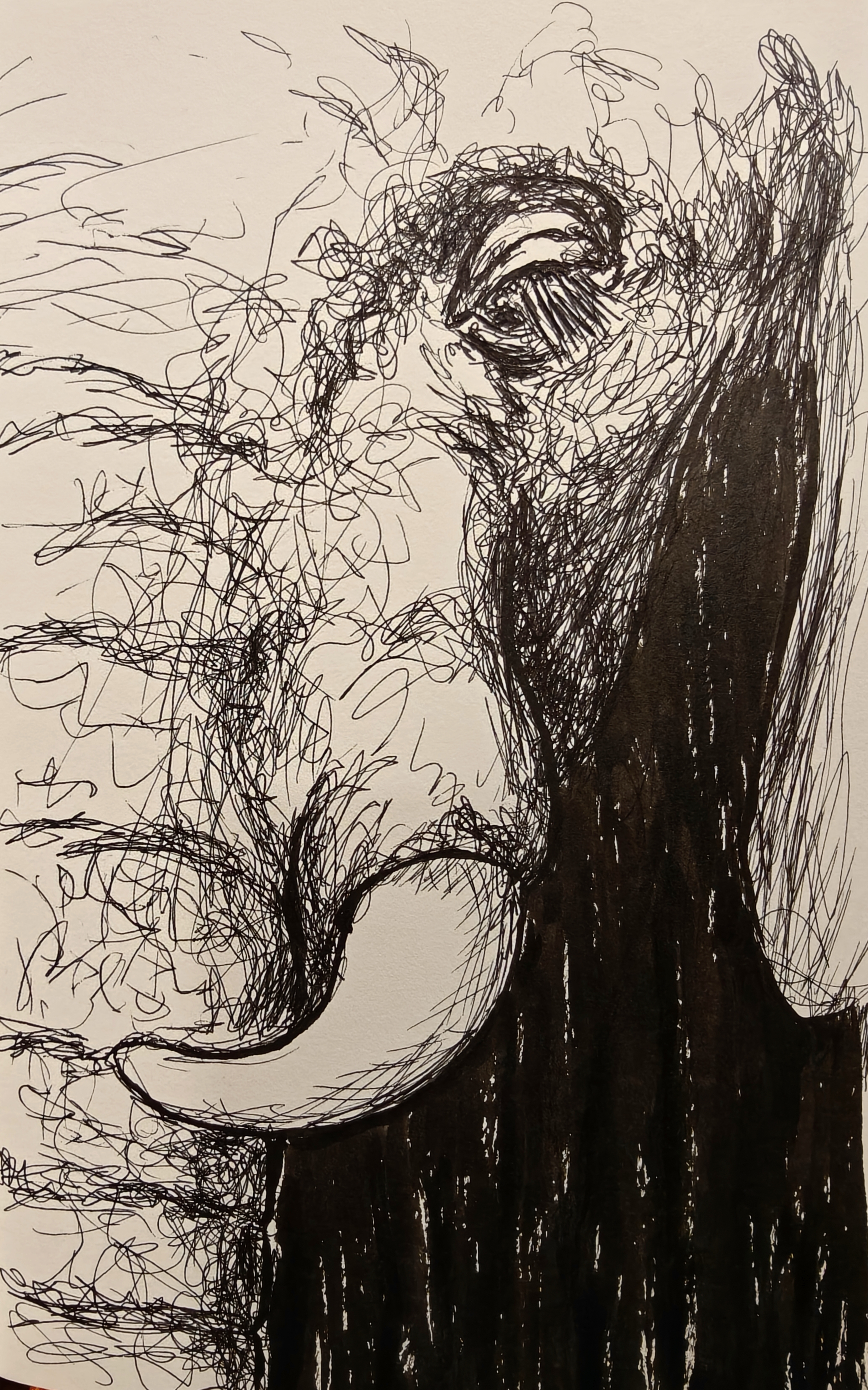 On of the drawings that I ended up liking quite a bit was for the Day 14 prompt, “Trunk”. I’d done a fun close-up scribble of an elephant. After getting some really positive response on that drawing, I decided to try and find out if I could translate the concept, scribbles and all, to 3D in Blender. This is the result: